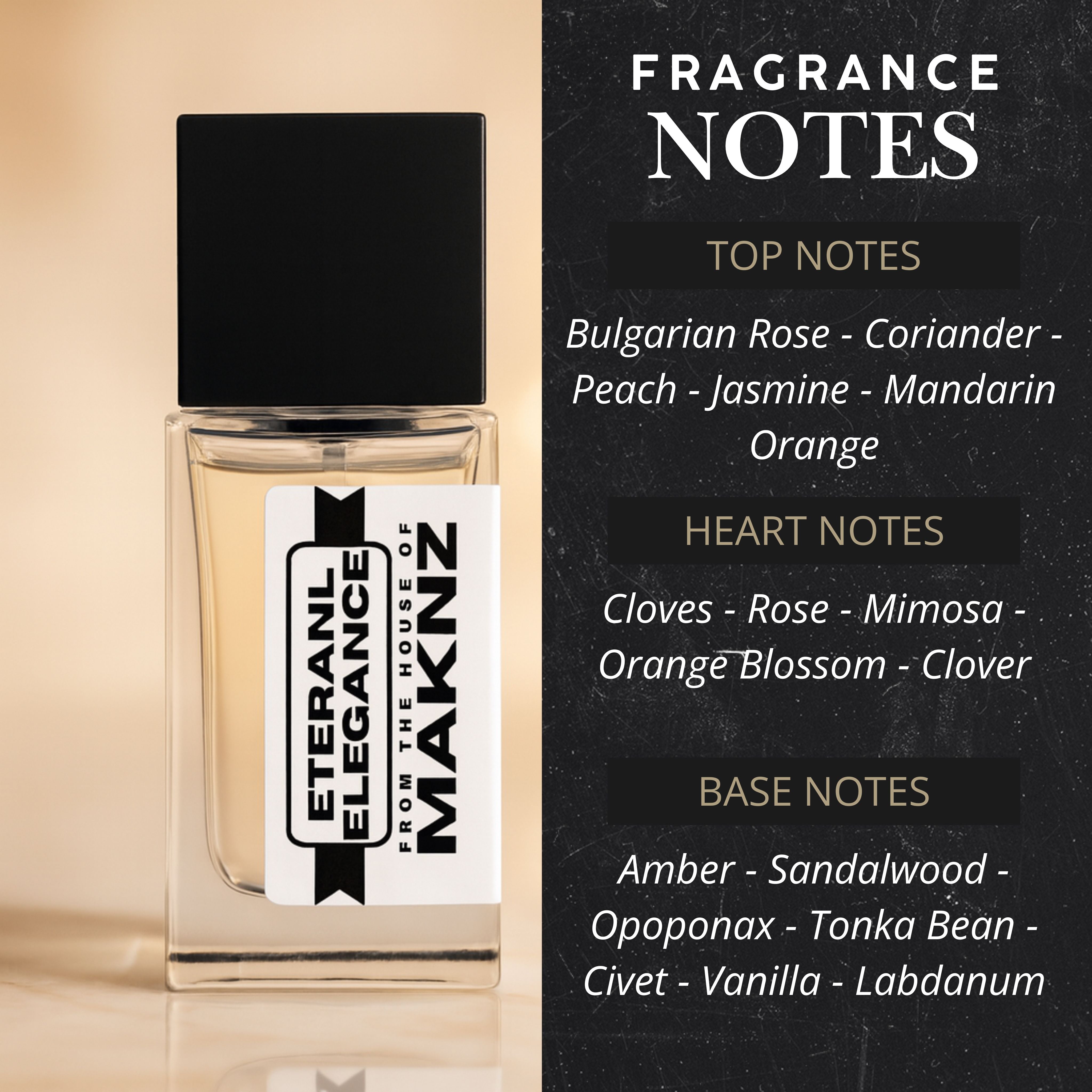 BASE NOTES : Amber, Sandalwood, Tonka Bean, Opoponax, Civet, Vanilla & Labdanum