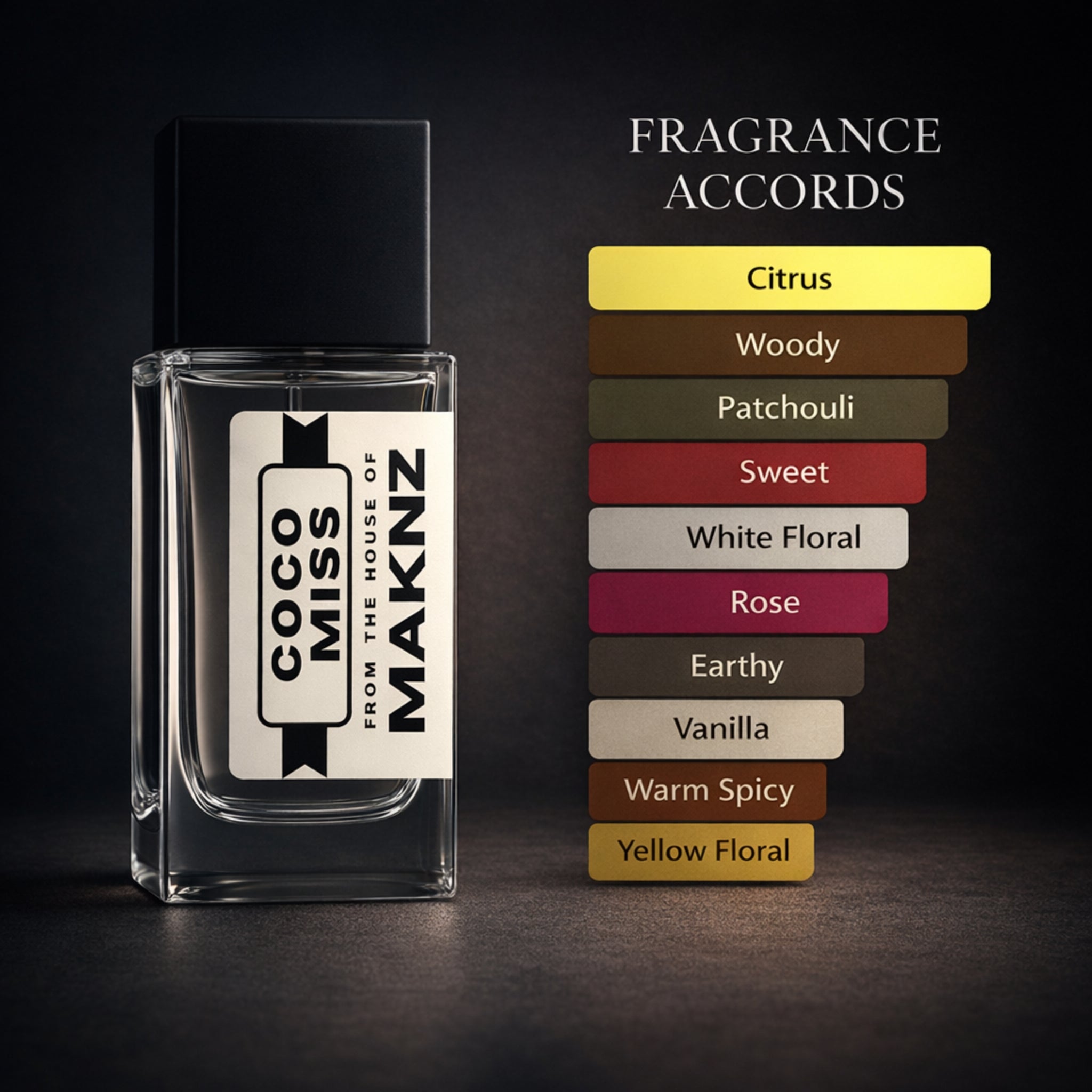 Base Notes: Patchouli, White Musk, Vanilla, Vetiver, Tonka Bean, Opoponax