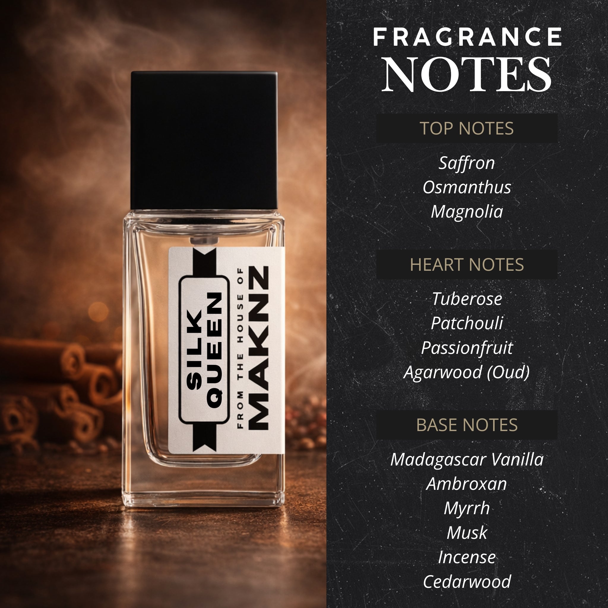 Mid Notes: Passionfruit, Tuberose, Patchouli, Agarwood (Oud)